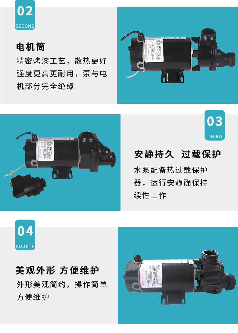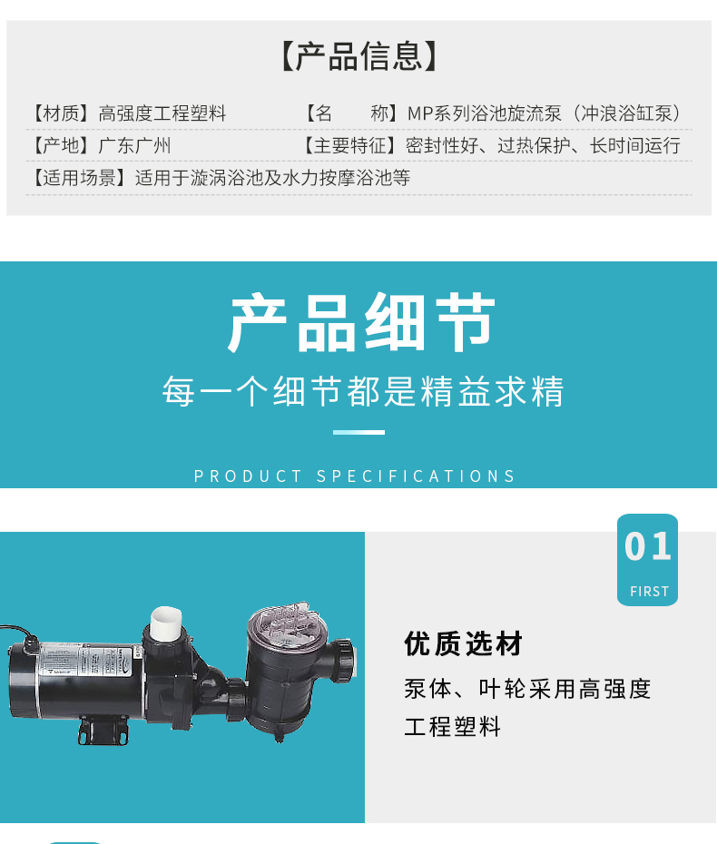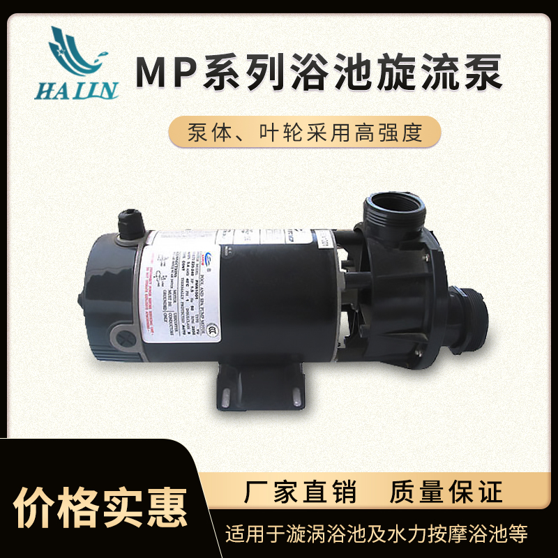 - MP系列浴池旋流泵(沖浪浴缸泵),泵體、葉輪采用高強度工程塑料。泵與電機部分完全絕緣,單相馬達安裝熱保護器,可長時間連續(xù)運行。配氣動開關(guān)操作,確保使用方便安全。
