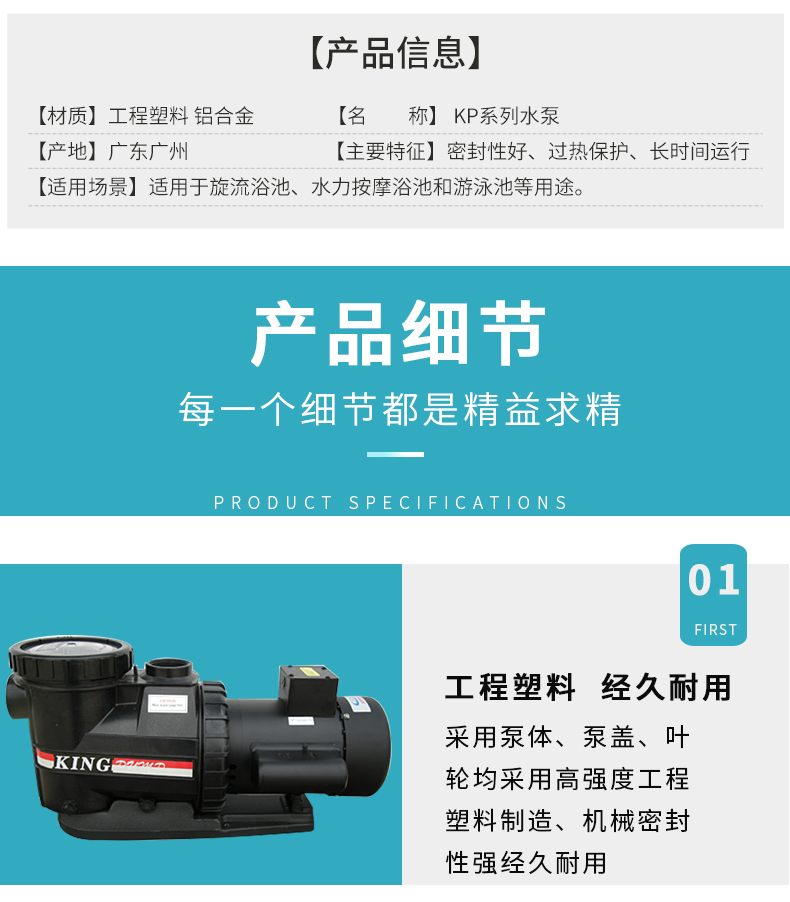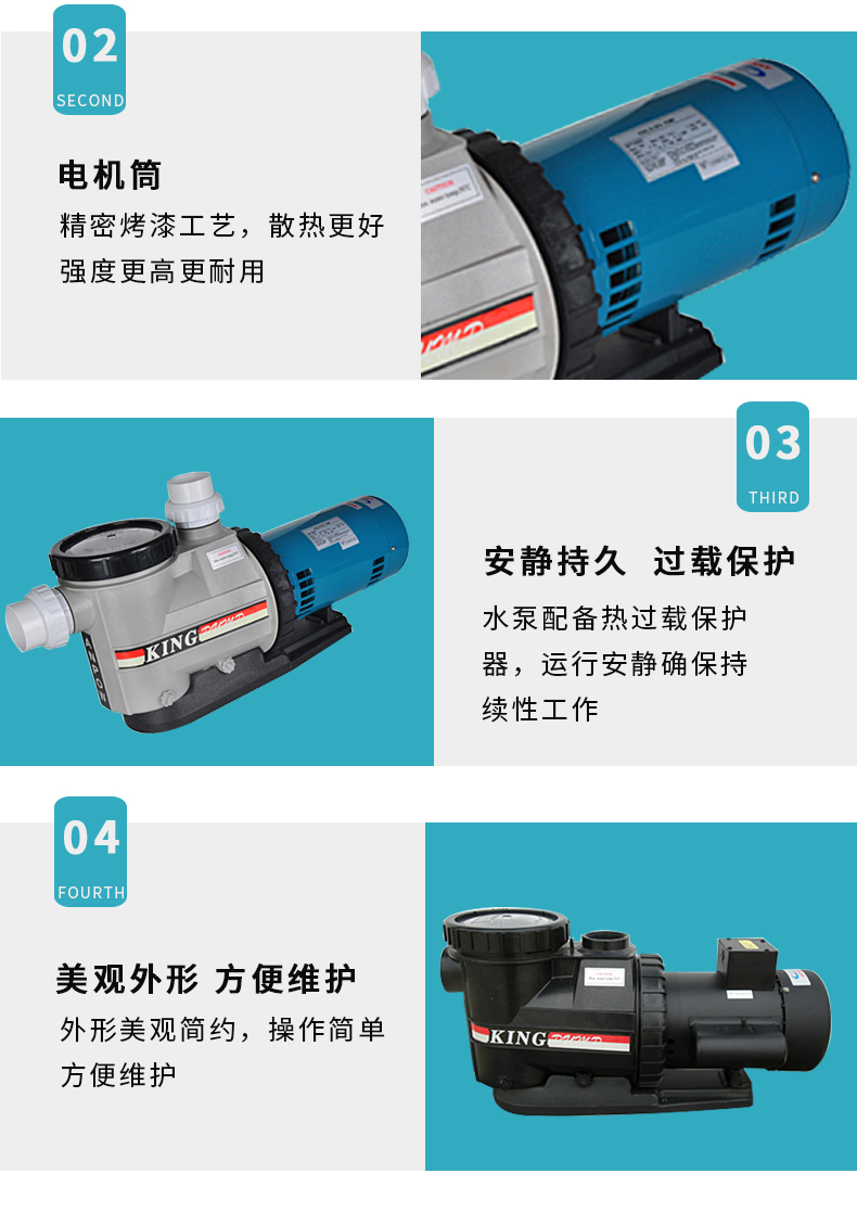 根據(jù)水力學(xué)原理設(shè)計的泵體,泵體、葉輪采用高強度工程塑料,經(jīng)久耐用。濾藍容量大,大大減少了清洗工作。性能好,效率高,加快了注水(灌溉)速度并提高了能源效率。適用于各種泳池、工業(yè)用水、海洋館、水上樂園等。