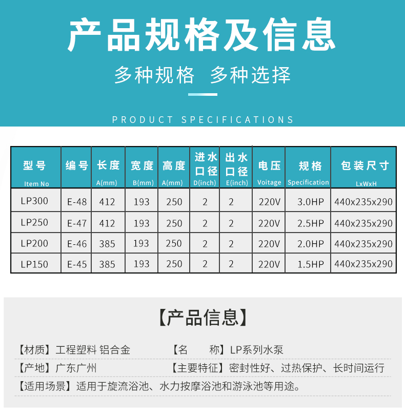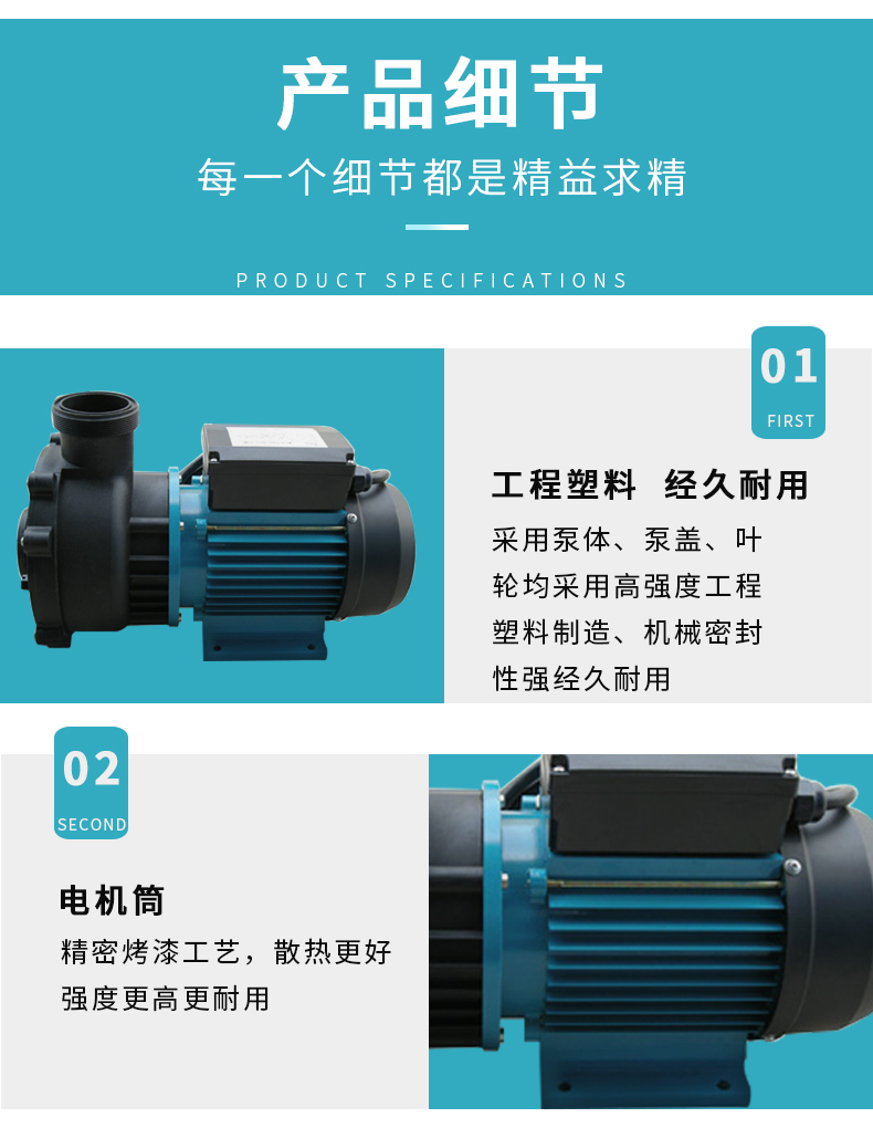 - 根據(jù)水力學(xué)原理設(shè)計(jì)的泵體,泵體、葉輪采用高強(qiáng)度工程塑料,經(jīng)久耐用。濾藍(lán)容量大,大大減少了清洗工作。性能好,效率高,加快了注水(灌溉)速度并提高了能源效率。適用于各種泳池、工業(yè)用水、海洋館、水上樂園等。
