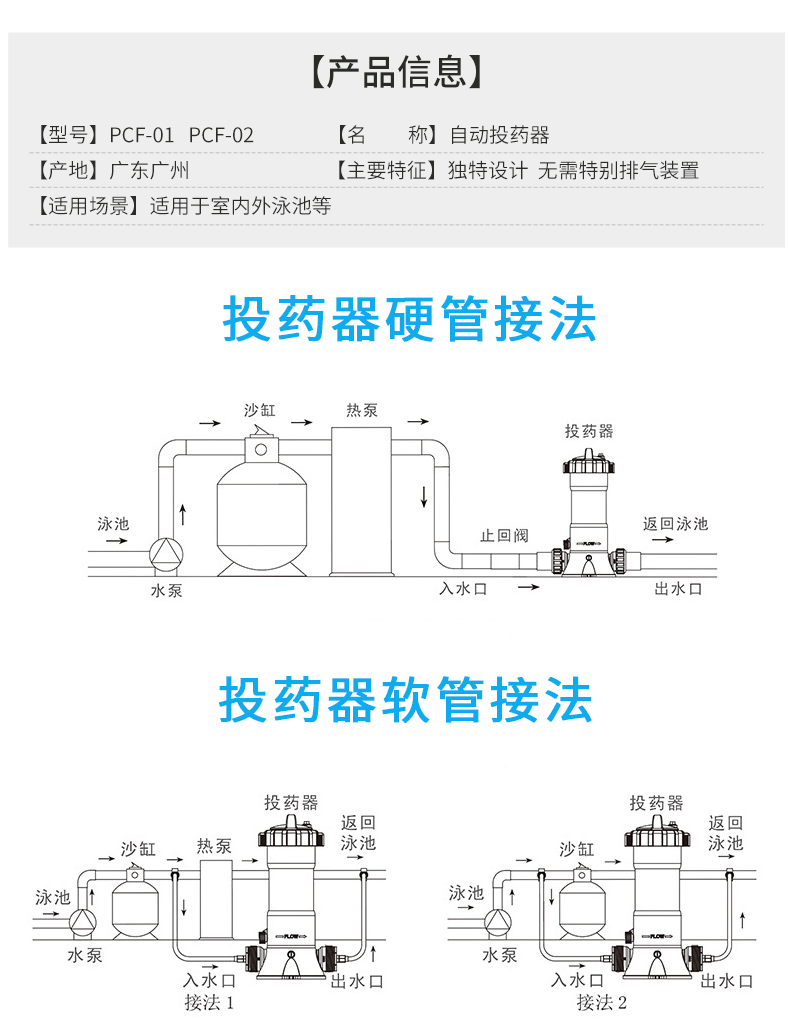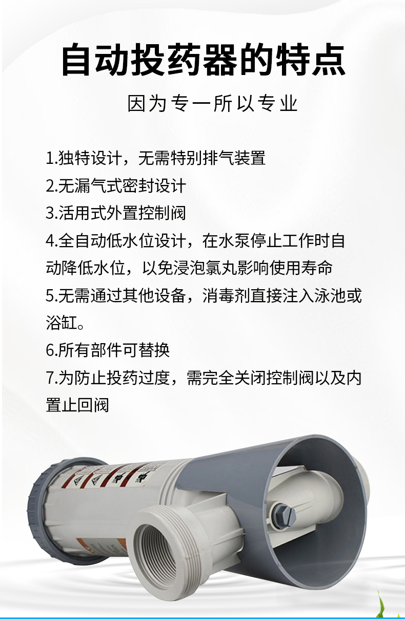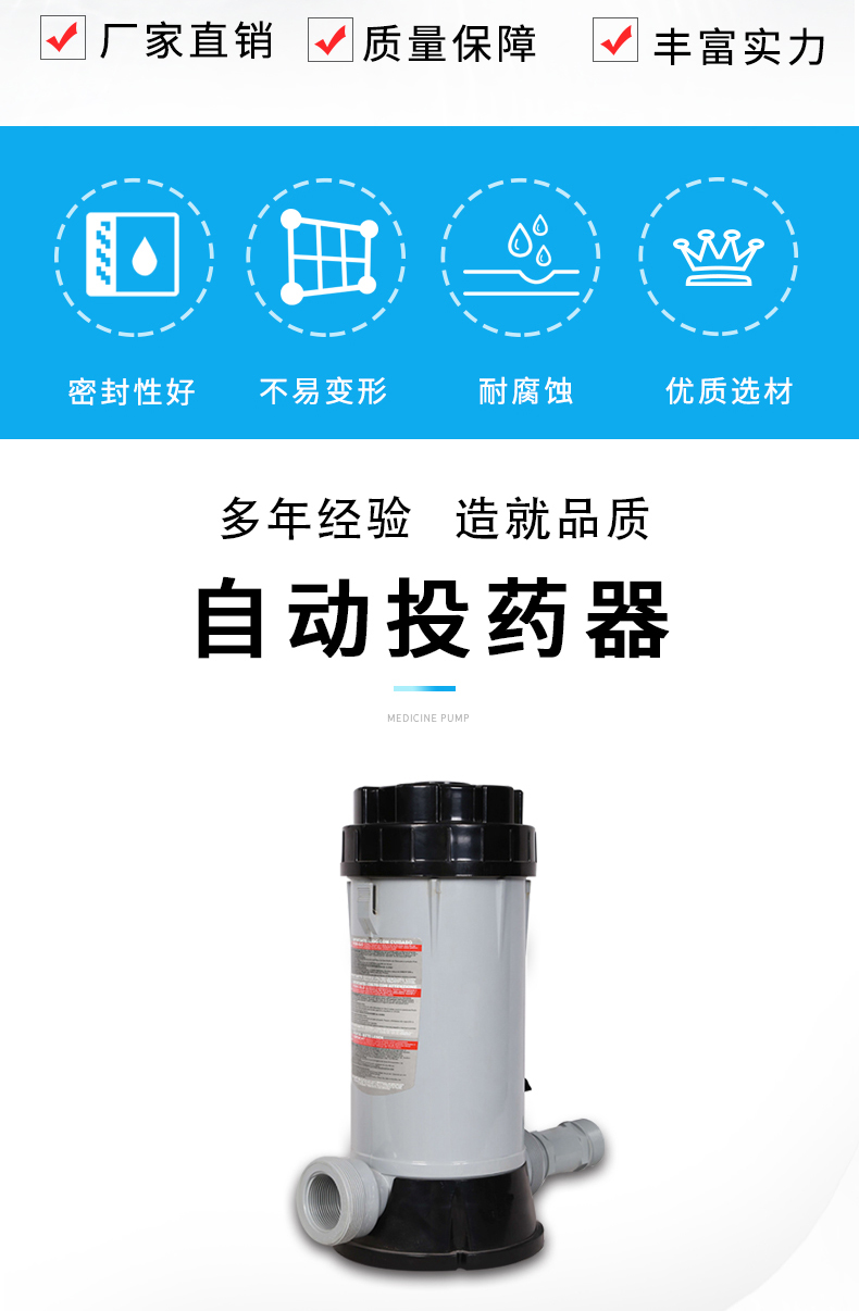 泳池藥物投加裝置,效率高,無須人工管理,控制安全可靠,節(jié)省人力,操作方便,省時省力。