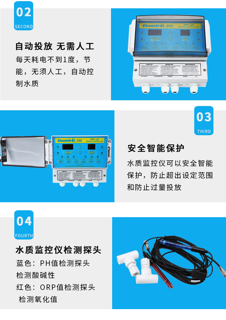 - 人工投藥藥量不穩(wěn)定,含氯/溴不足,細(xì)菌,藻類容易滋生。使用全自動監(jiān)控儀,每天耗電不到1度,無需人工,自動控制水質(zhì),商家游泳池理想匹配產(chǎn)品。